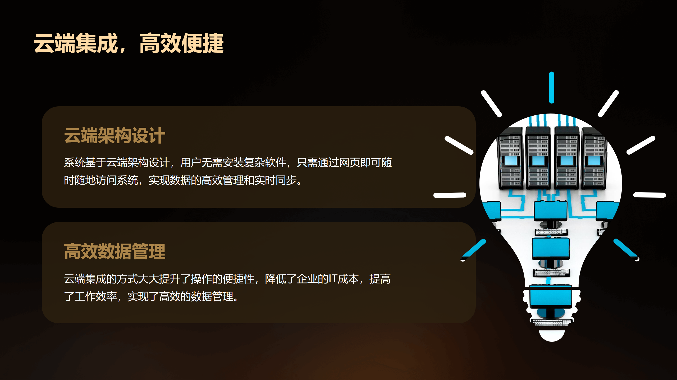 1. 云端集成,高效便捷:系统基于云端架构设计,用户无需安装复杂软件,只需通过网页即可随时随地访问系统,实现数据的高效管理和实时同步。这种云端集成的方式大大提升了操作的便捷性,降低了企业的IT成本。