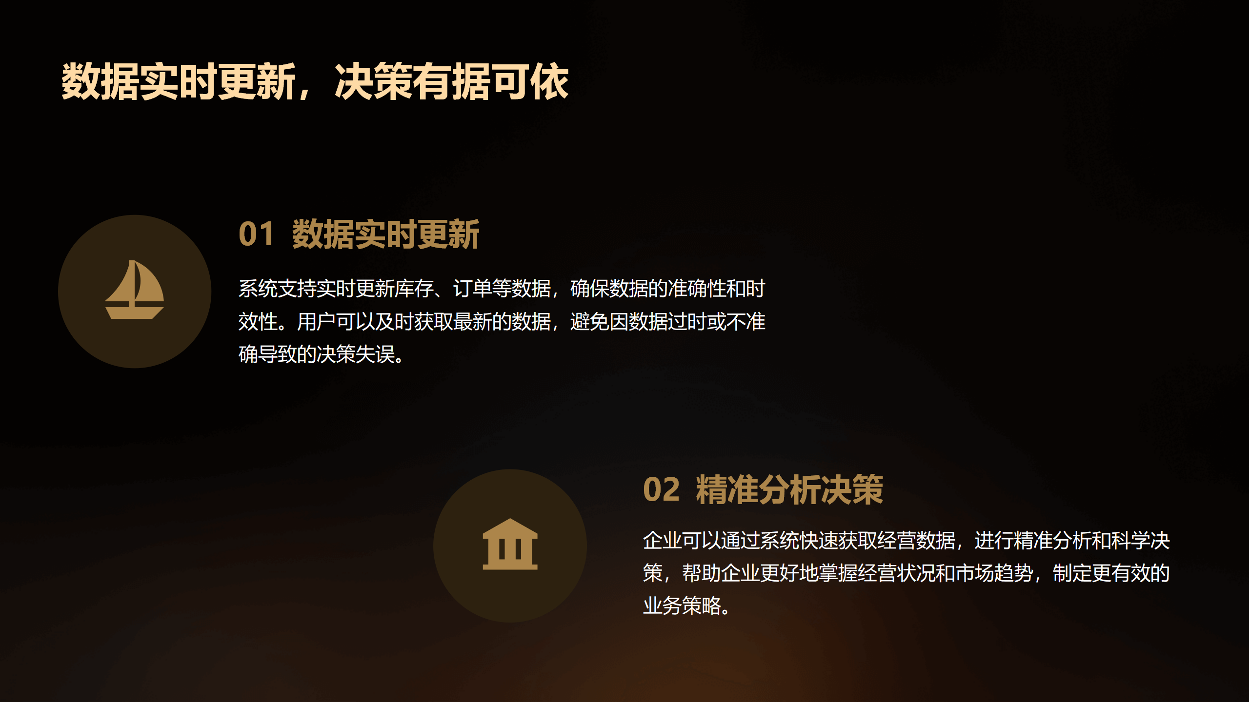 4. 数据实时更新,决策有据可依:系统支持实时更新库存、订单等数据,确保数据的准确性和时效性。企业可以通过系统快速获取经营数据,进行精准分析和科学决策,帮助企业更好地掌握经营状况和市场趋势。